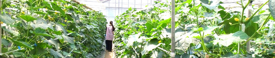 キュウリはビニールハウスを併用し通年栽培をしています。安心して食べられるよう、減農薬による栽培を行っています。